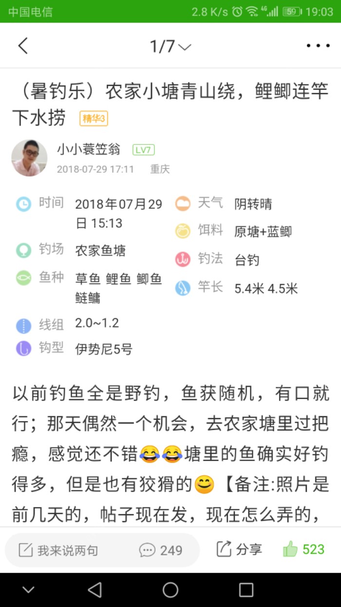 以前钓鱼全是野钓,鱼获随机,有口就行;那天偶然一个机会,去农家塘里过把瘾,感觉还不错??塘里的鱼确实好钓得多,但是也有狡猾的?【备注:照片是前几天的,帖子现在发,现在怎么弄的,改不了时间了】 今天周末...