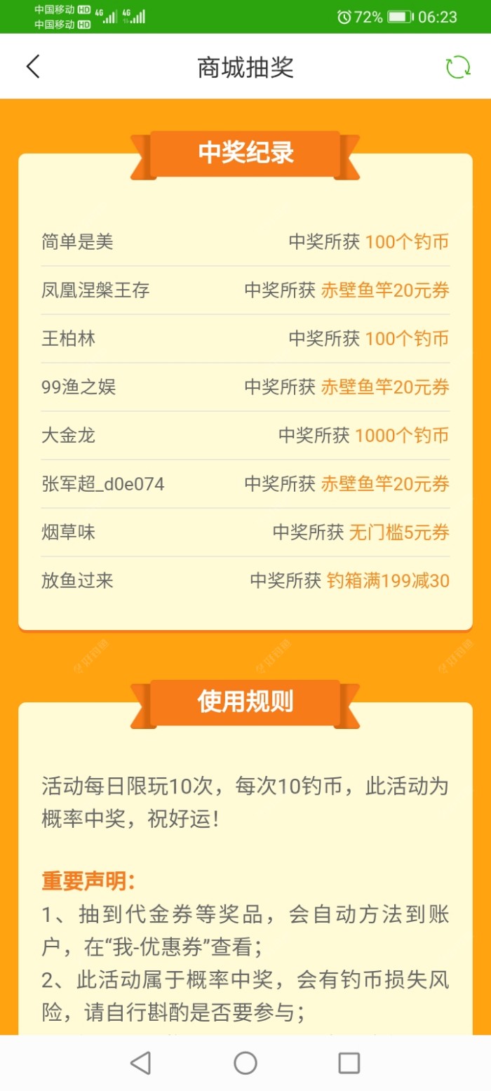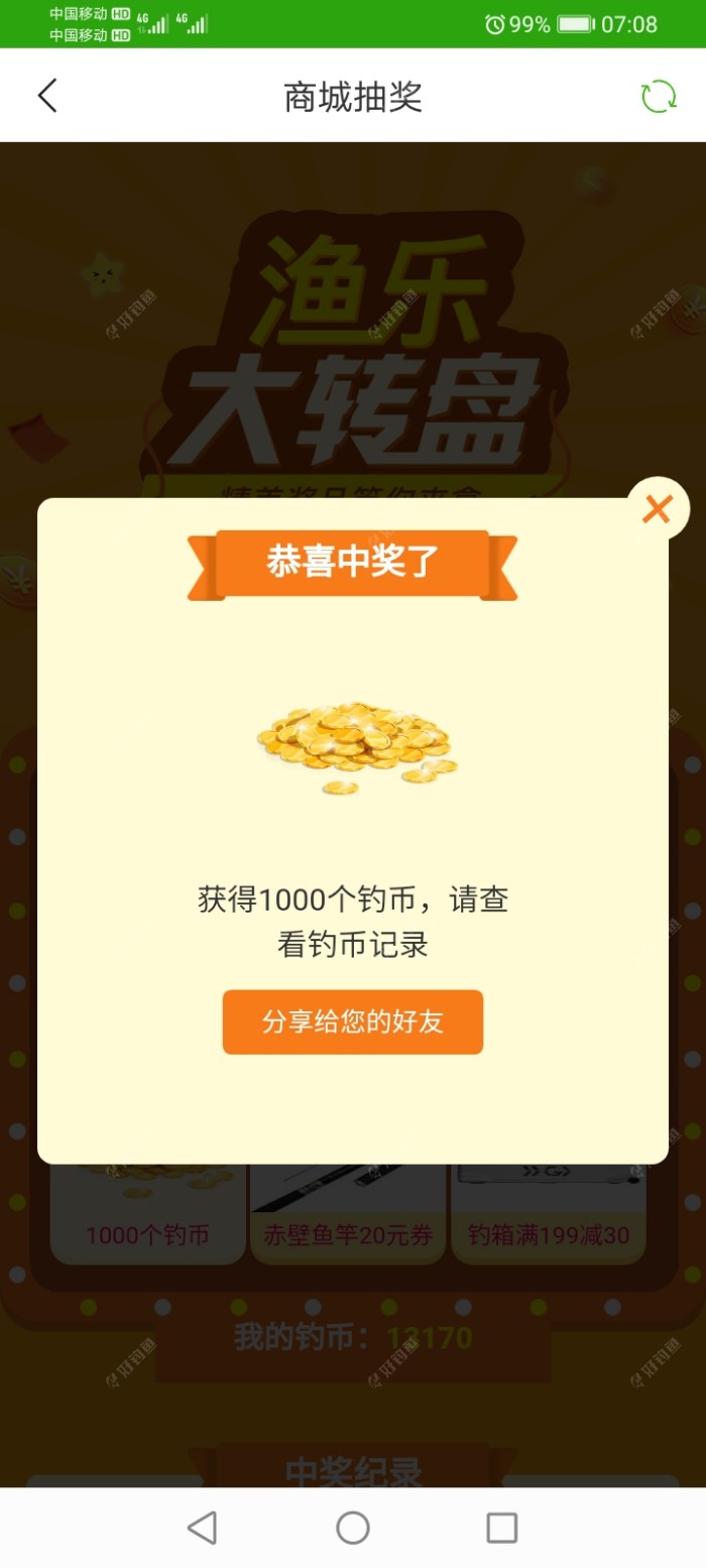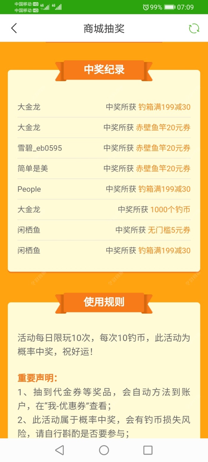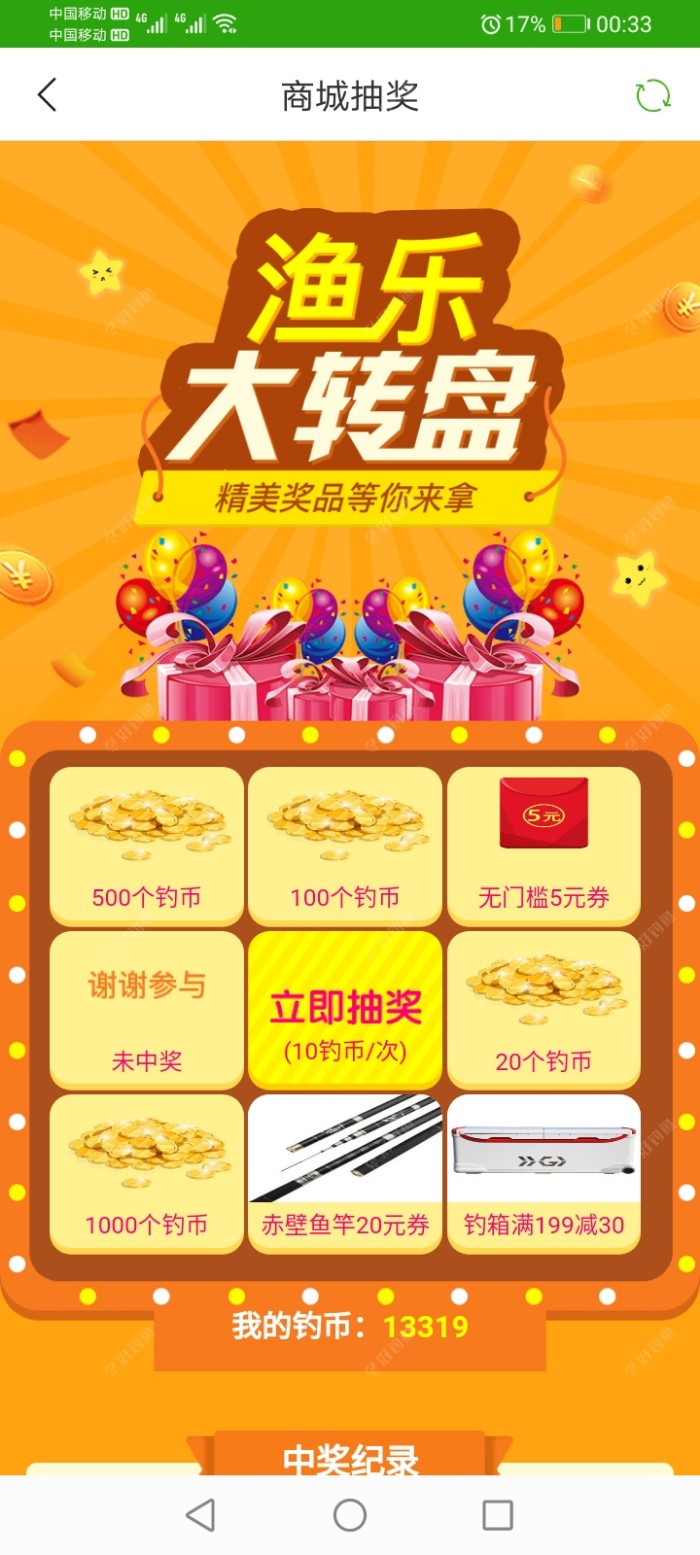 好多钓友都不玩大转盘,我坚持每天都转它十圈,大奖中无数次了,有时也亏大了,但娱乐同乐最重要!