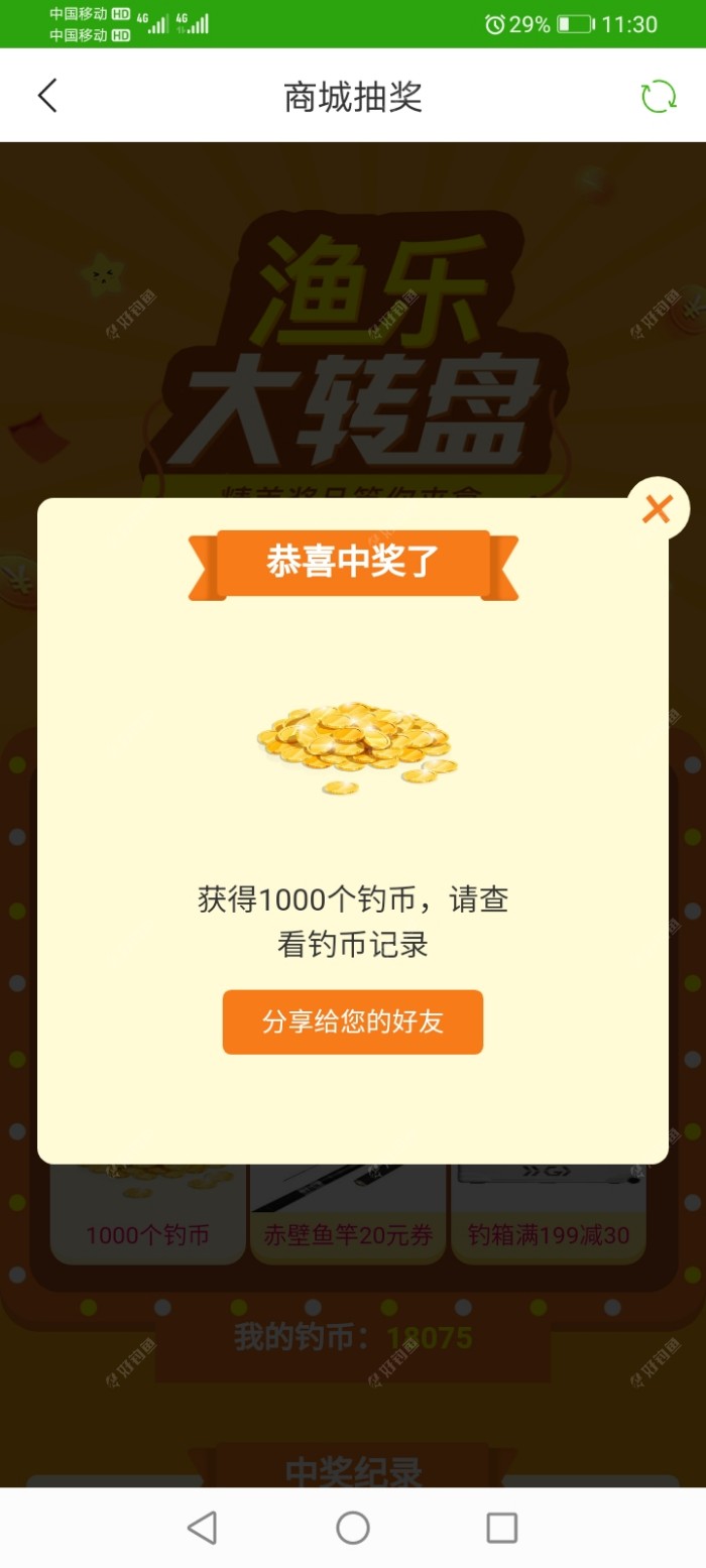 今天又抽中大奖啦!高兴,坚持不懈的努力结果!希望大家新年大鲫大鲤!都来好钓鱼渔乐大转盘参加抽奖!