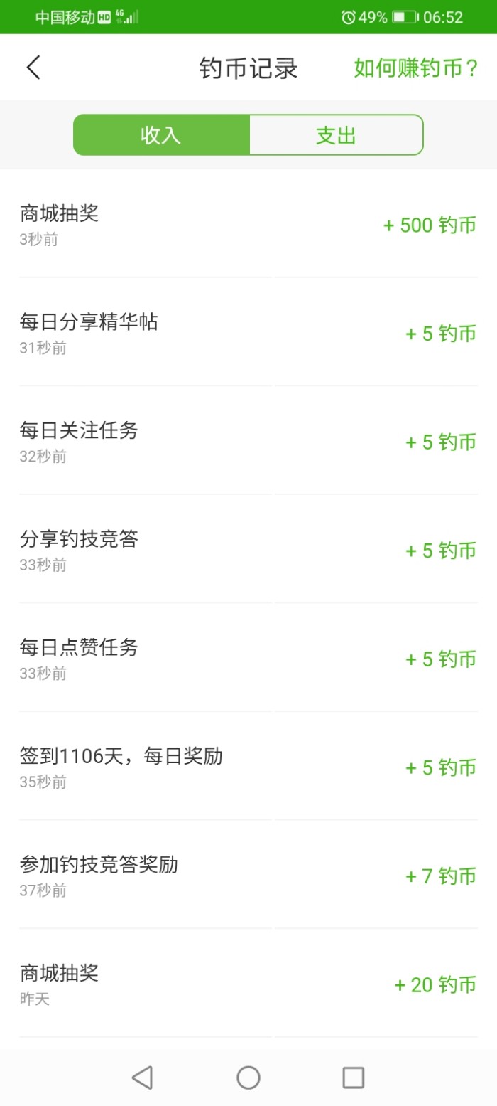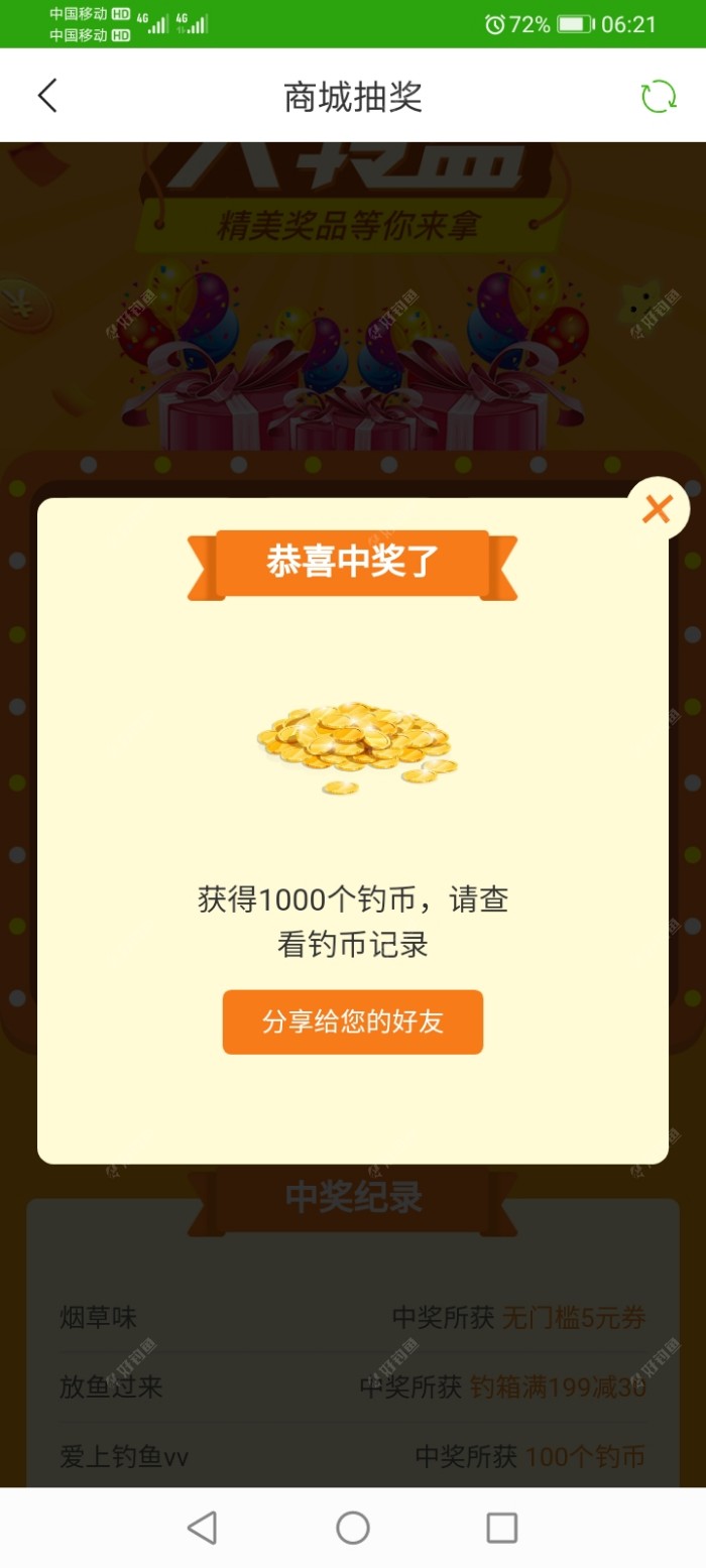 好久没有中大奖了,今天刚抽中500钓币,真是功夫不负有心人,坚持不懈最重要!