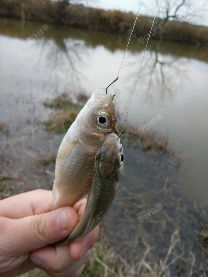 天气很好29度,1亩多的鱼塘,水面上很多小参条,水深1米左右,5.4米手竿双钩,江湖猎人饵单开,钓鲫鱼,拉饵钓,饵一入水就被参条抢,鱼获如图,囧