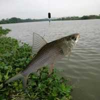 东江海竿上的两大物,第一竿就上了大鲤鱼,忘拿抄网,把鱼遛得不窜了才拖上岸,一条三斤左右拖到岸脱钩没抓住跑了,吸取教训,马上去把抄网准备到旁边,大白鲢上钩边遛边抄