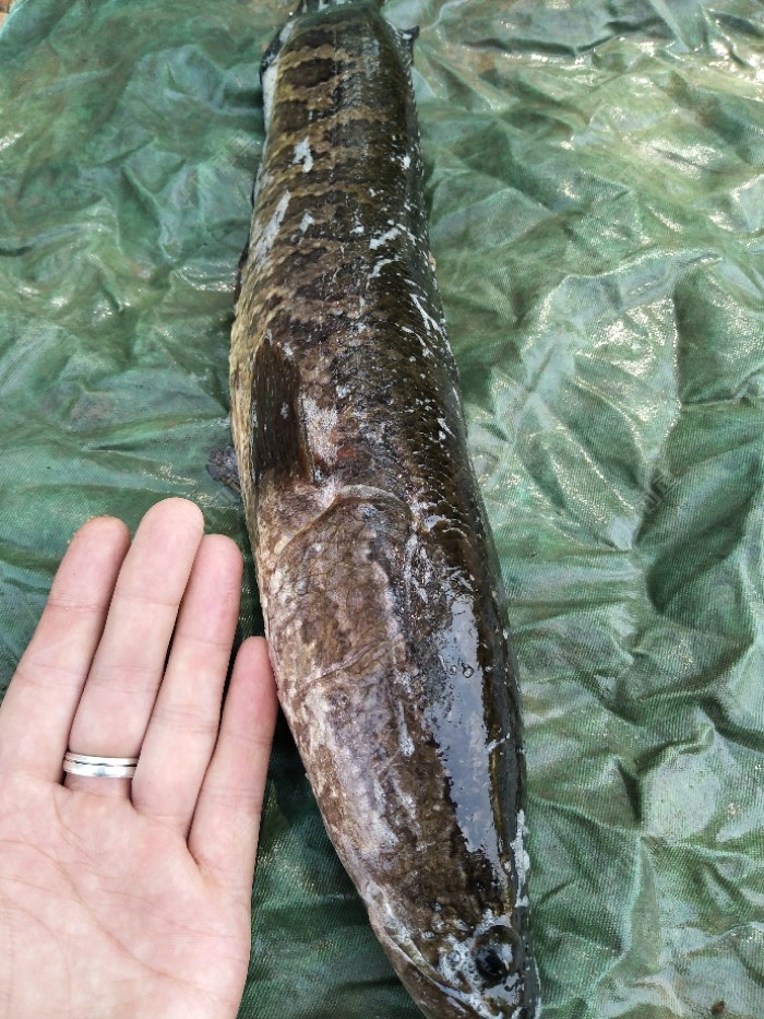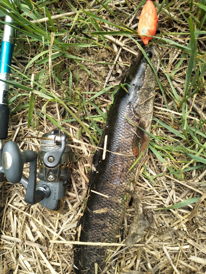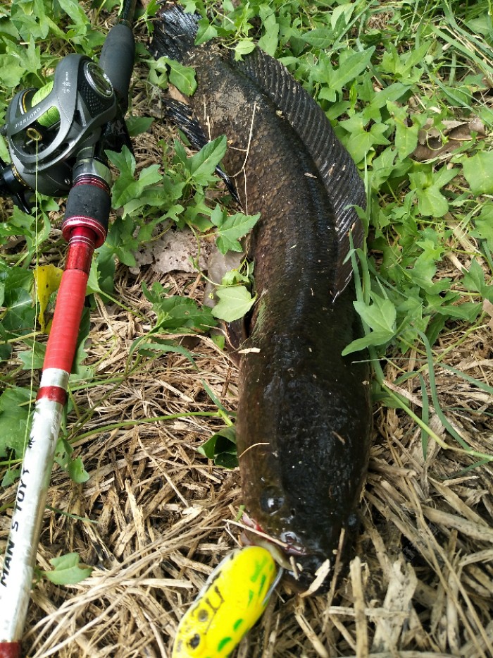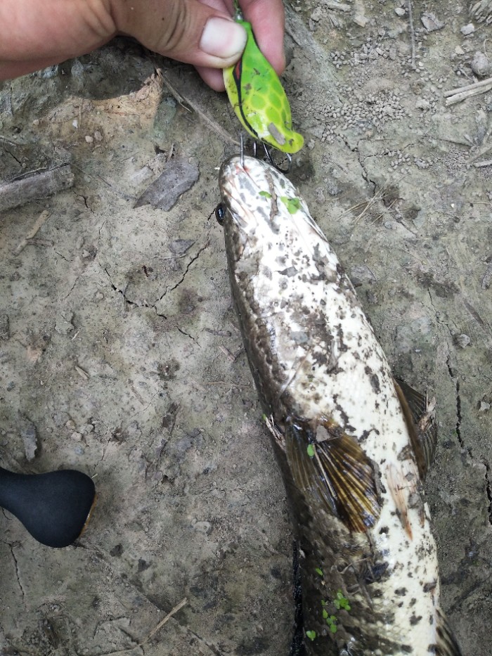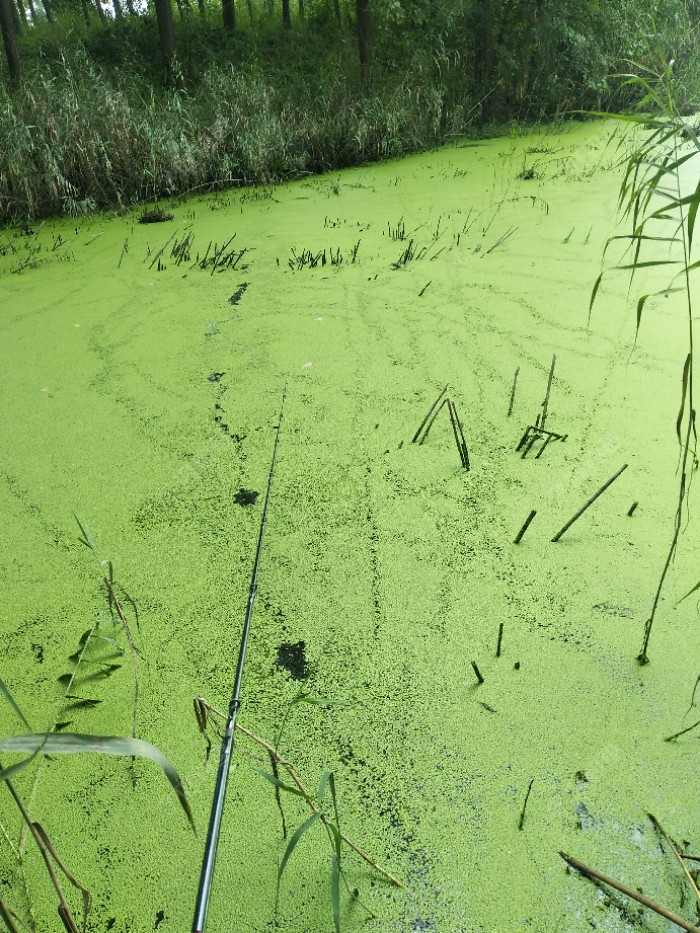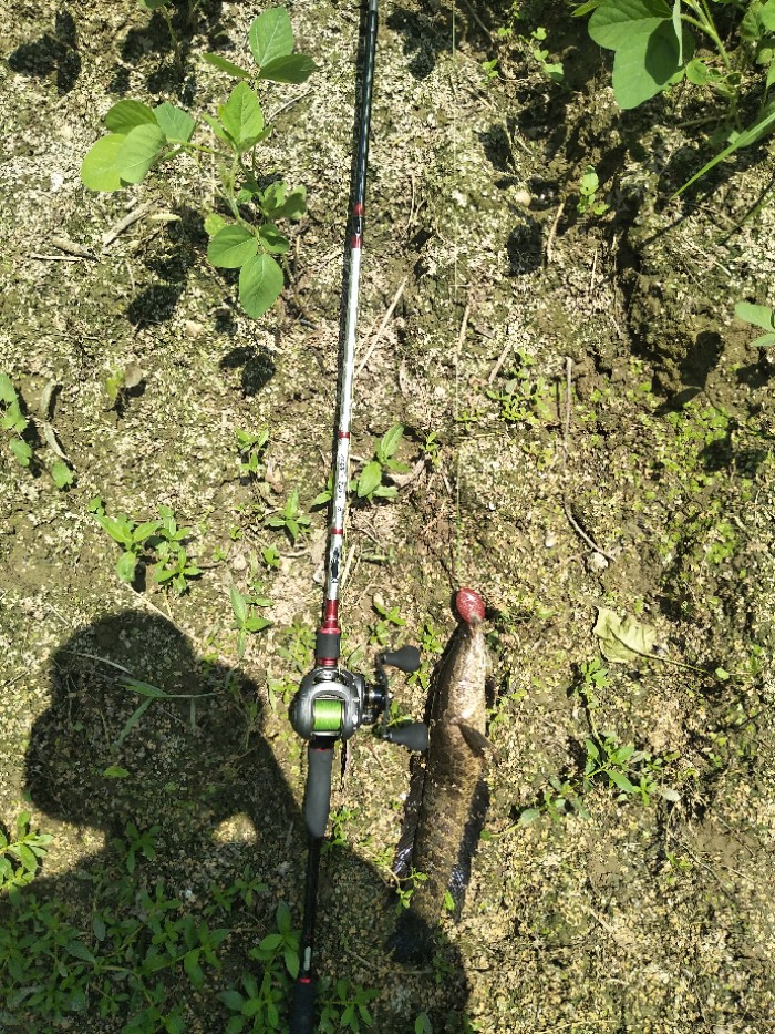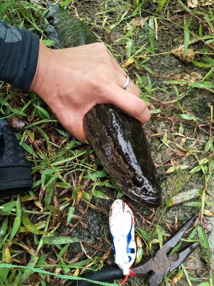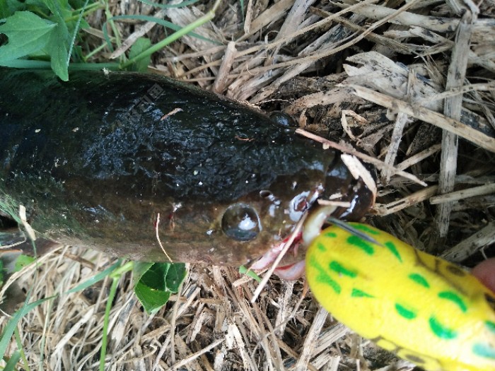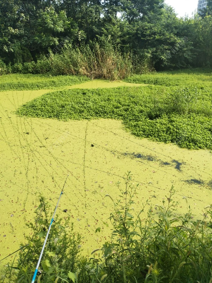 今天有大雨,天昏暗闷热,午饭后穿上水鞋出去碰碰运气。刚开始使用骆驼蛋,搜了十几竿冷不丁来一口,口不轻,可惜没咬中,蛙还在也就没杀竿,再逗不吃了,第二条也是这种情况。我就纳闷了,口很生却没咬中。嗯,水草...