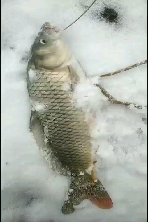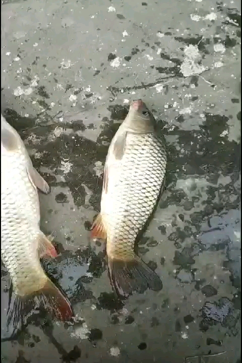 下了夜班睡到中午吃了午饭感觉离小夜班还有点时间拿上鱼竿去河边玩一个小时吧。到了老地方下去就上一个二斤鲤鱼。后面断断续续跑鱼。感觉鱼跑完了换个地方。去昨天对面的地方。昨天一群人喊着鲤鱼都在我这边我打到鲤鱼窝了。。到了对岸半小时斗俩一个一斤一个三斤。这下旁边的闭嘴了。一会雪下大了赶紧收拾回家。到家正好亲戚都在把冰箱里几十条鲤鱼都分分。后面几天只要不下雪接着干。