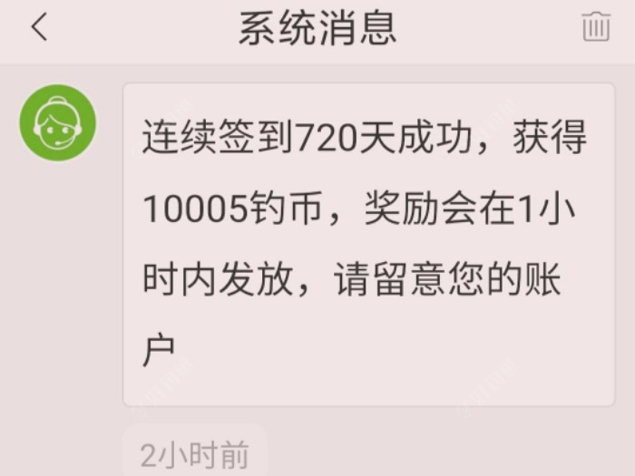 今天连续签到第720天,也是入住【好钓鱼】两周年的日子 文/仲渝 早上,来到【好钓鱼】APP签到,转瞬收到了【好钓鱼】系统通知:“——连续签到成功,获得10005钓币,奖励将在一个小时内发放,请留意您...