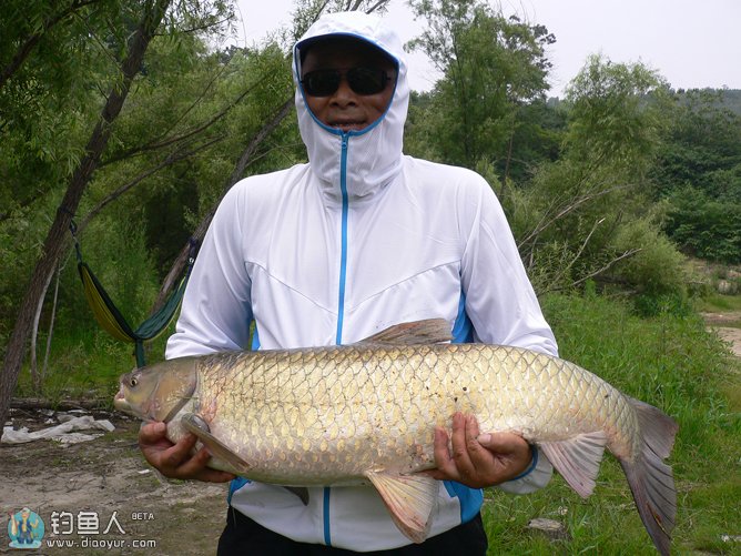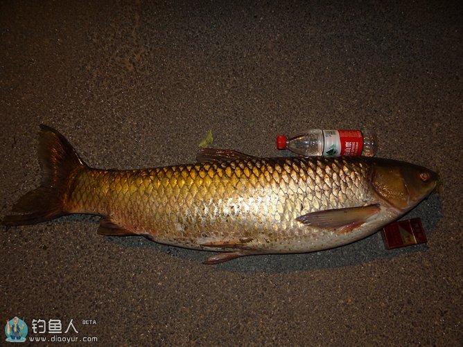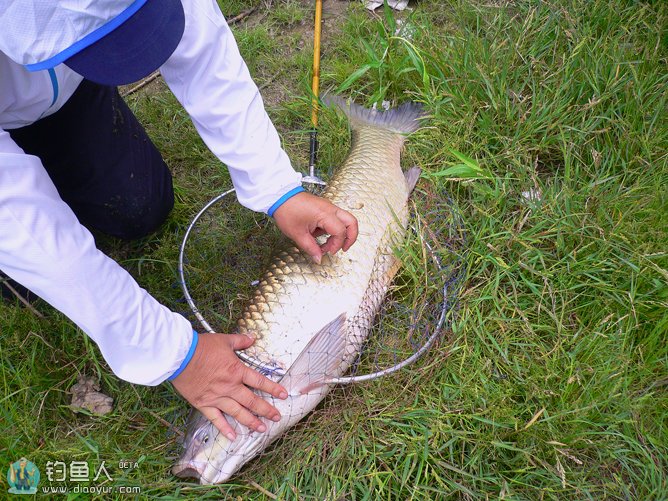 这时来了几位当地的老钓手,在他们传授与大鱼搏斗的经验和鼓励之下,我们又重新燃起了与之搏斗下去的信念,近两个小时之后,WJT19700718发现鱼钩马上要脱落的险情,我俩进行了最后一次牵鱼近岸,在从当地钓友手中借来的大抄网的帮助下,成功擒获大草上岸。